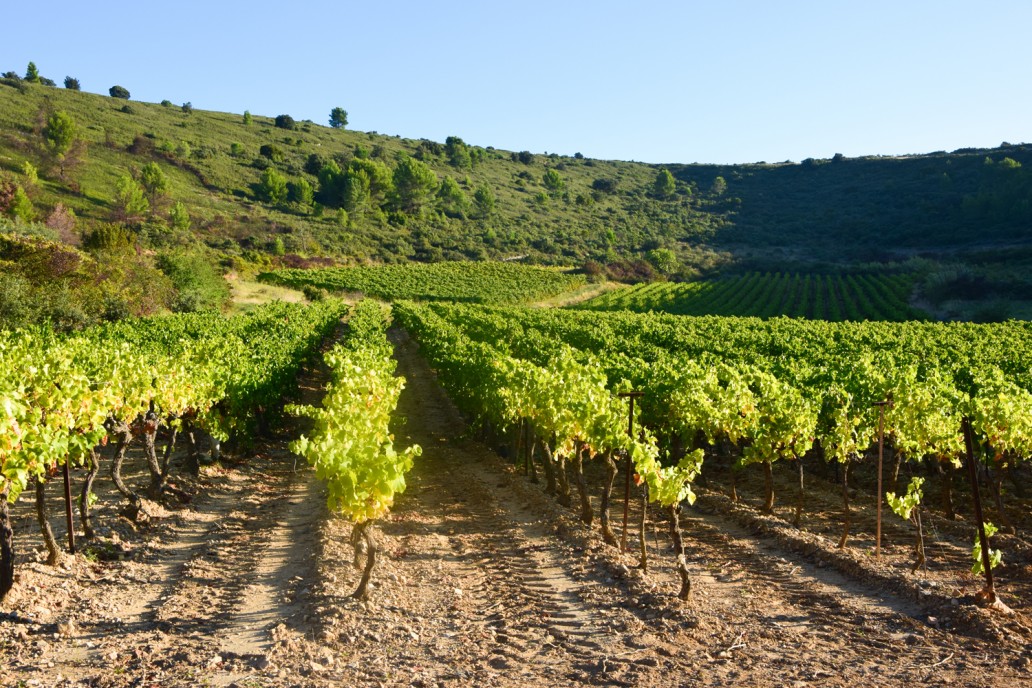 Au vignoble les parcelles plantées en coteaux suscitent un intérêt de chaque instant. Taille sévère, ébourgeonnage sélectif, fumure organique, travail des sols et utilisation de la confusion sexuelle ont toujours fait partie de notre travail. Notre vignoble est certifié en agriculture biologique. Nos vignes situées sur la partie la plus fraîche de l’appellation Grés de Montpellier bénéficient d’un microclimat unique. Plantées sur les versants nord du plateau d’Aumelas la fraicheur du climat y est significative. Des nuits plus fraiches et des altitudes moyennes plus élevées, cause de maturités plus lentes et régulières des raisins nous poussent à des vendanges plus tardives que nos voisins (mi-septembre) pour offrir des vins emprunts de finesse et de complexité. Le peu de raisins produits sur nos vignes nous assure une belle expression du terroir marquée par la fraicheur aromatique et la finesse des tannins présents dans nos vins. Un chai moderne, semi-enterré en parfaite harmonie avec le terroir, grâce aux matériaux naturels utilisés (bois et pierre du Gard) et à son toit photovoltaïque nous permet de poursuivre notre éthique de travail et d’accompagner la qualité de nos raisins jusqu’aux bouteilles.